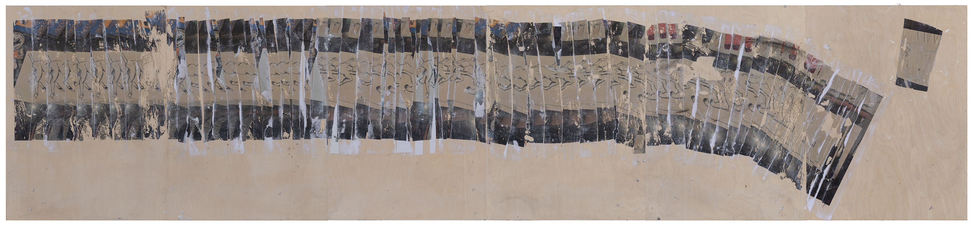 synthetic polymer, marble dust, toner, paper, ink, archival varnish on board
